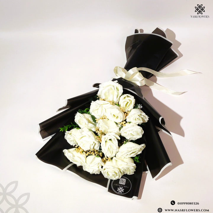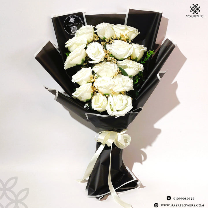 بوكيه بلانكا إليغانس هو انعكاس للنقاء والرقي، حيث تتألق الورود البيضاء الصناعية في تنسيق مفرود يمنحها مظهرًا طبيعيًا وانسيابيًا. تتخللها لمسات من البيبي فلاور البيج التي تضيف لمسة دافئة ومتناسقة، بينما يُغلف البوكيه بتغليف أسود أنيق يعزز من جمال الزهور ويضفي عليها طابعًا عصريًا فخمًا. هذه الباقة مثالية للهدايا الفاخرة، المناسبات الخاصة، وديكورات المساحات الراقية التي تحتاج إلى لمسة من التميز.